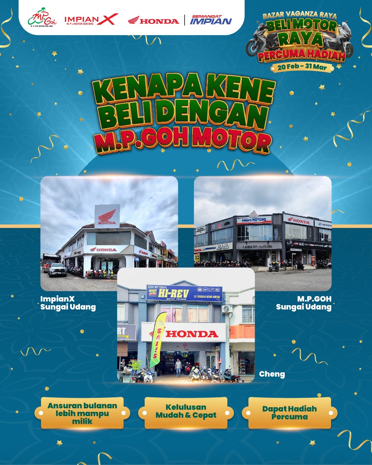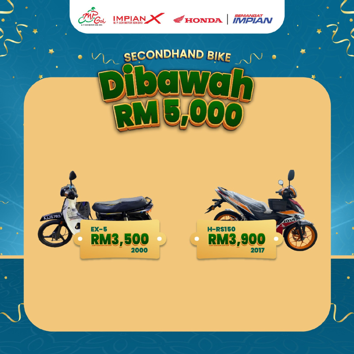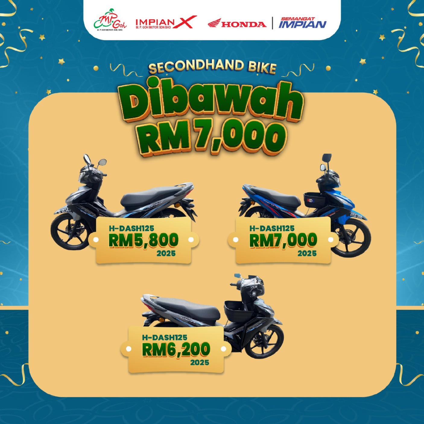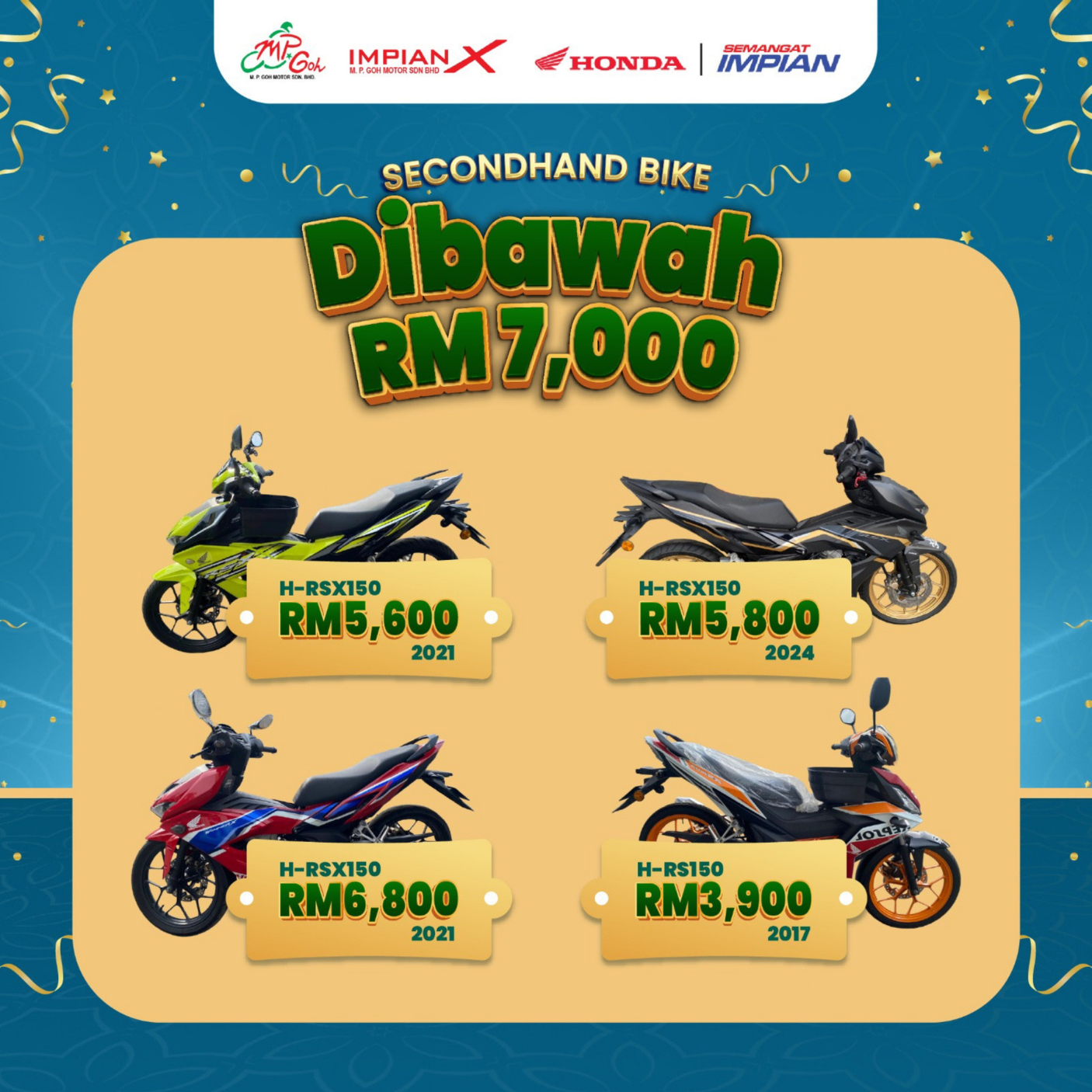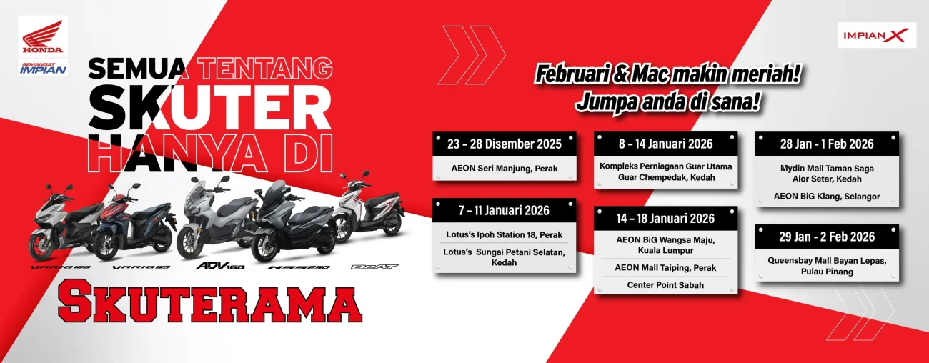 Campaigns & Promotions Serving Riders, Families, and Community for 50 Years Explore current offers and campaigns for Impian-X and Honda BigWing. Register Interest Whatsapp Us Register for Promotions Fill in your details to unlock exclusive Honda rewards and limited-time offers. We will send your promo details via WhatsApp. Full Name WhatsApp Number Select Promotion Low Interest Rate Campaign Rider Starter Pack (Free Gifts) Cash Rebate / Discount Service & Maintenance Promo Model of Interest I want to receive the latest Honda campaign updates and vouchers via WhatsApp. Claim Promotion via WhatsApp